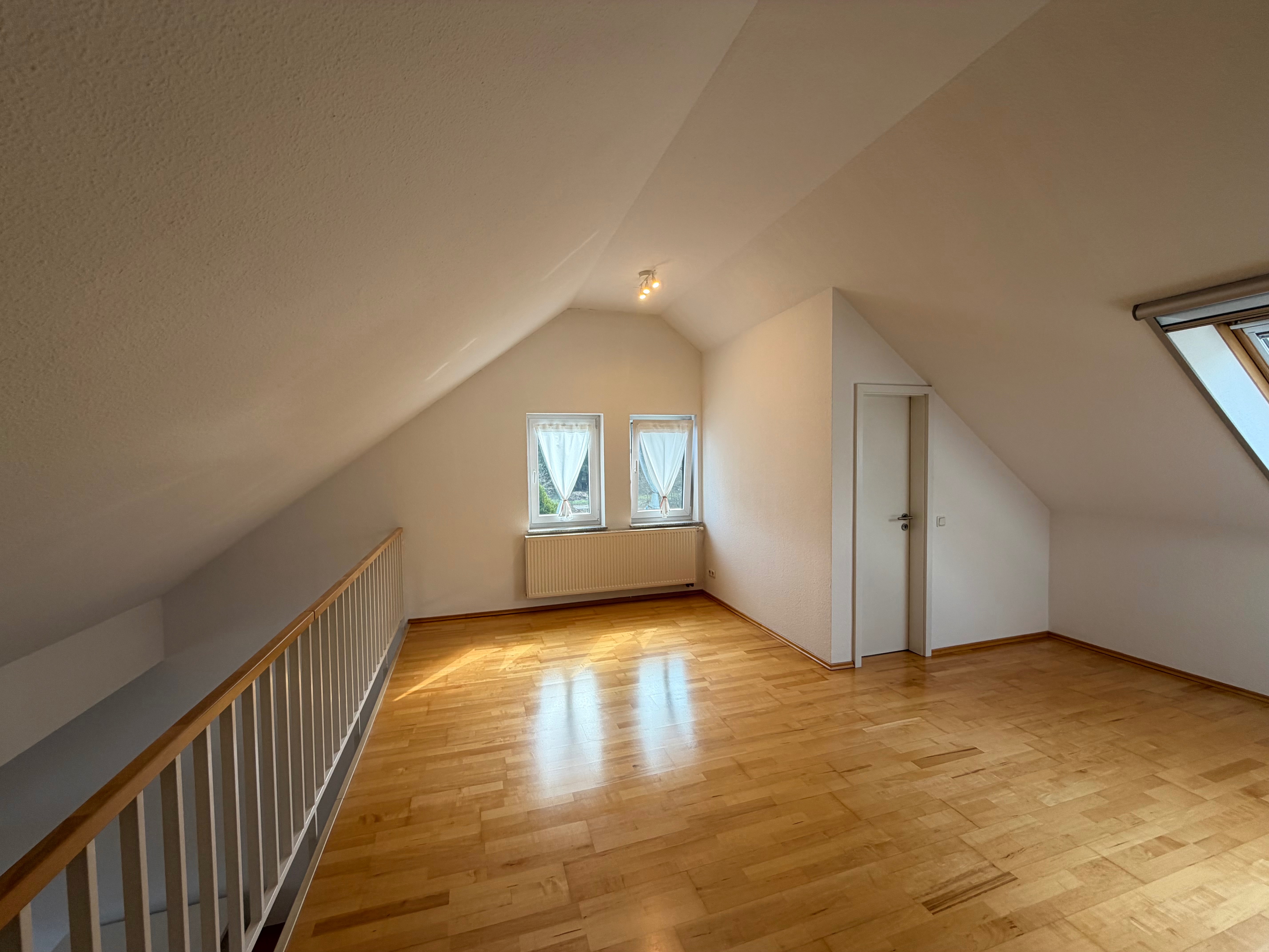 Das Badezimmer verfügt über ein Fenster und ist mit Badewanne und Dusche ausgestattet, wodurch ein hoher Wohnkomfort geboten wird. Über eine Treppe gelangt man in den oberen Bereich der Wohnung, der mit einem großzügigen, offenen Galeriebereich begeistert. Auch hier sorgt Parkettboden für eine wohnliche Atmosphäre. Die Galerie schafft ein besonderes Raumgefühl und ermöglicht den Blick hinunter ins Wohnzimmer. So entsteht ein offenes und großzügiges Wohngefühl, ohne dass die Behaglichkeit verloren geht. Ein separates WC im oberen Bereich ergänzt den Komfort dieser Ebene ideal.